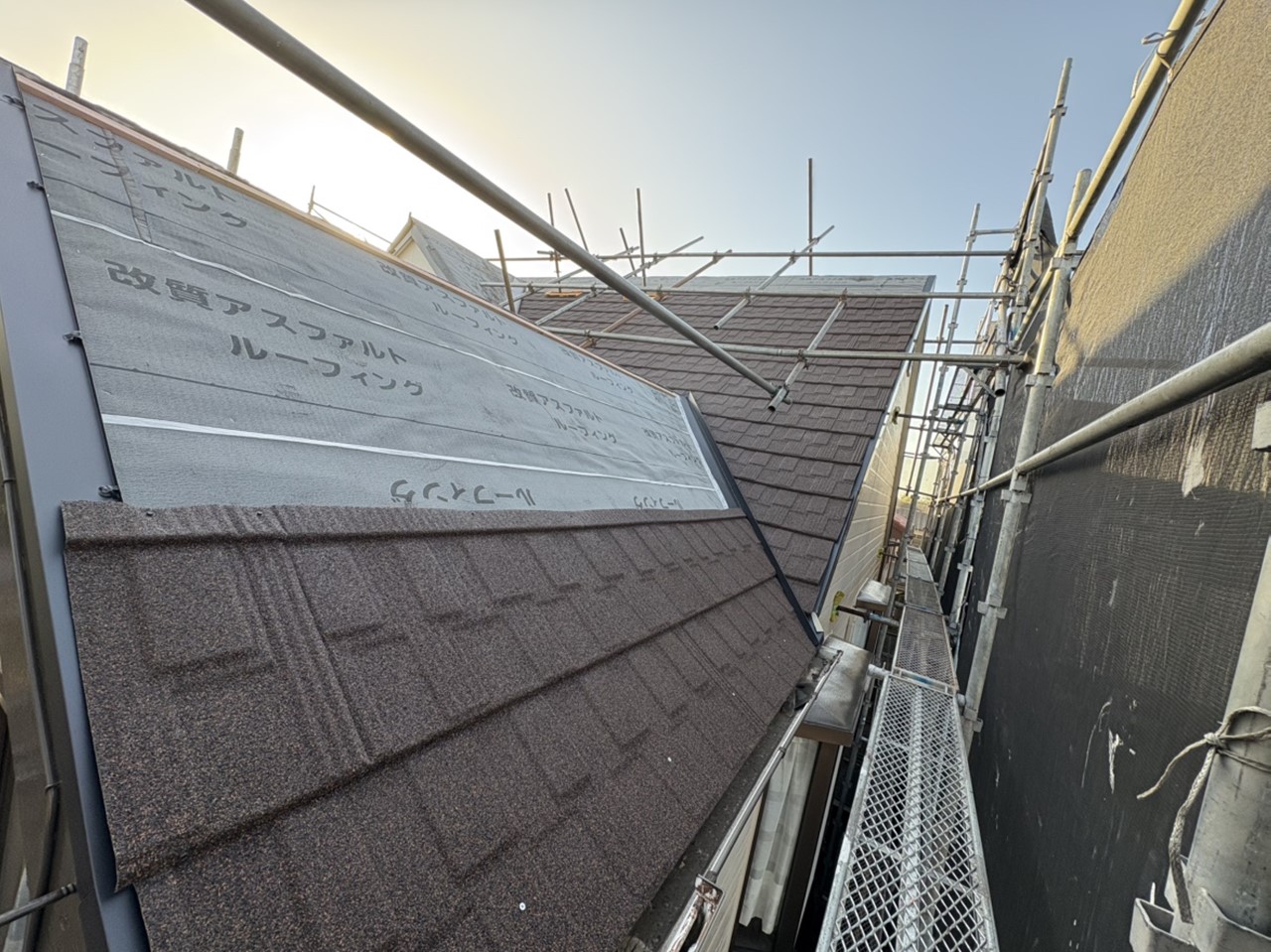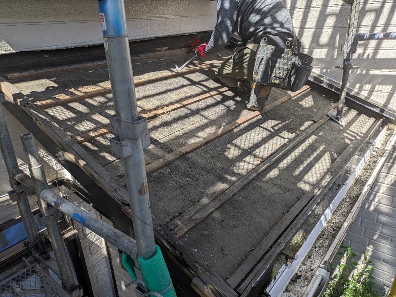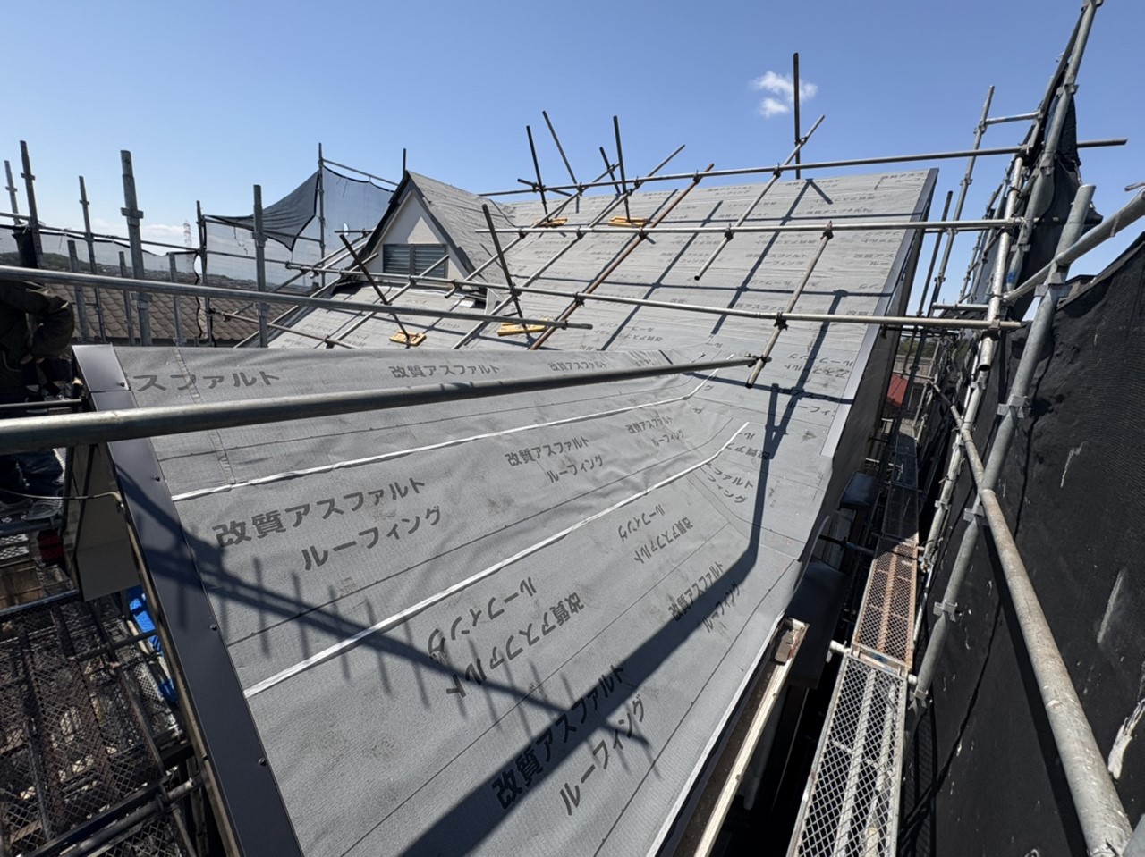撤去、掃除は防水のための改質アスファルトルーフィングを設置していきます。