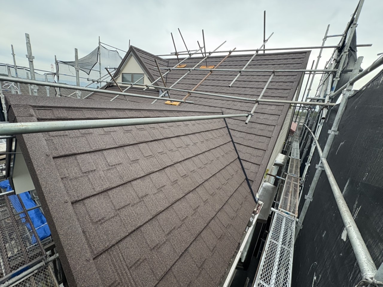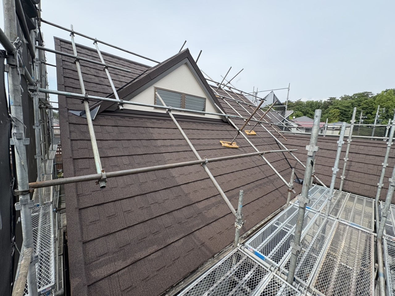 部分的な修理という方法もありますが、今回は今後の再塗装の有無も考慮して石付き板金屋根に葺き替え工事をすることに。