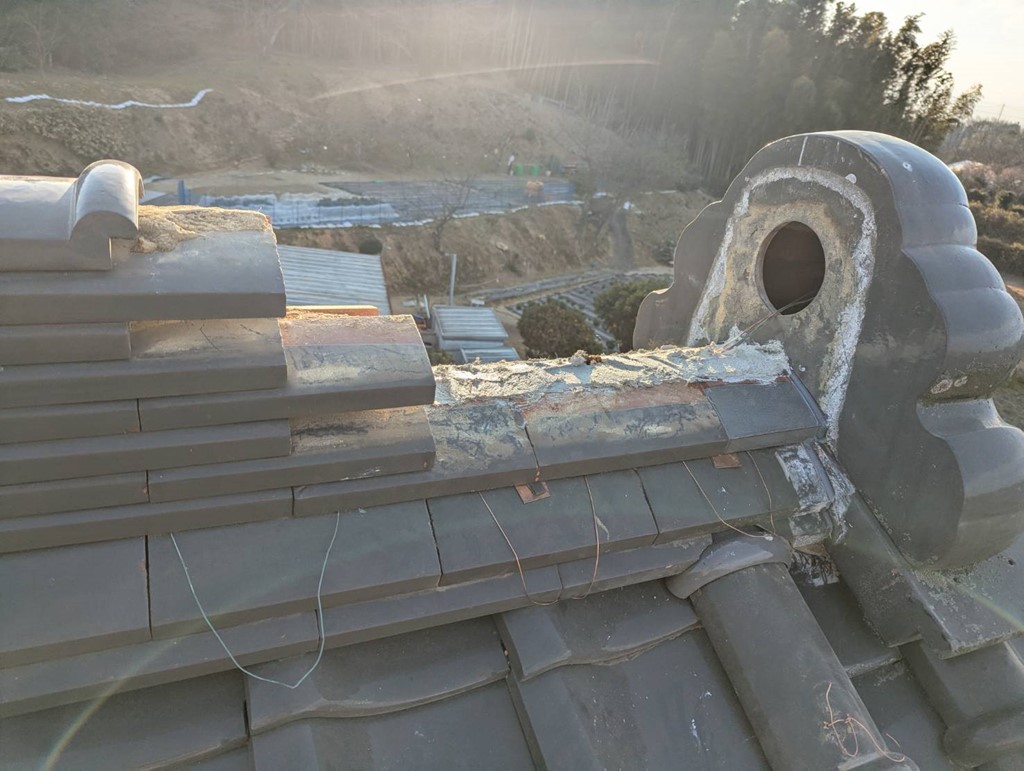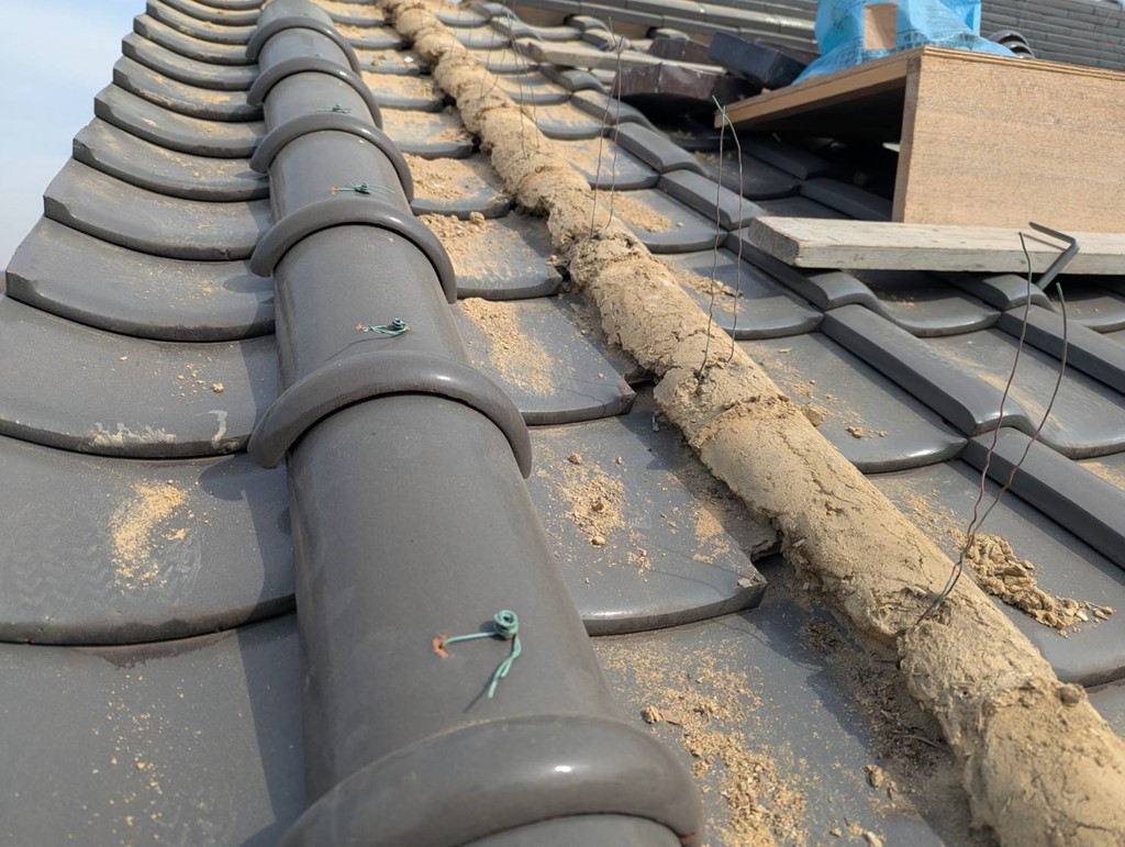 その後は漆喰(モルロック)を積み上げていき、その上から紐丸瓦を再設置して銅線緊結をしていきます。