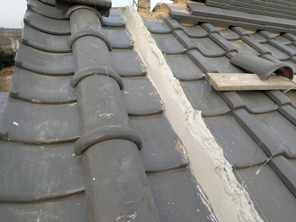 最後に風切丸瓦が完了したら棟部分ののし瓦を直していきます。